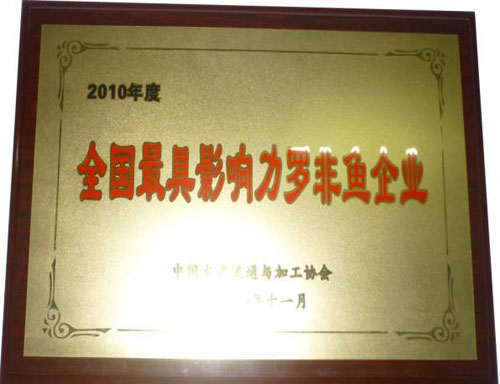 2010年 全國(guó)最有影響力羅非魚企業(yè) 中國(guó)水產(chǎn)流通與加工協(xié)會(huì)頒發(fā)