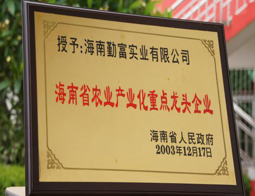 2003年 海南省農(nóng)業(yè)產(chǎn)業(yè)化重點(diǎn)龍頭企業(yè) 海南省人民政府頒發(fā)
